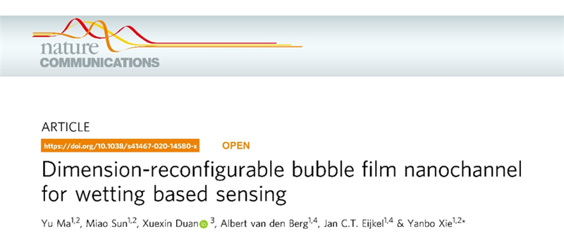 谢彦博团队在Bretherton气泡薄膜研究方面的突破性进展。该研究利用阻抗测量等方法率先实现了固体界面上Bretherton气泡薄膜厚度的准确测量,而这也是自1961年Bretherton提出管道中气泡运动以来一直困扰的问题。同时论文还展示了其作为一种新型的三相界面纳米通道的潜质,不仅能够实现现有纳米通道的离子极化等功能,还可以作为一种新的生物检测原理,开拓了一类新的尺寸可调控的软物质纳米通道。该论文的第一作者为我校博士研究生马昱,唯一通讯作者为谢彦博教授。