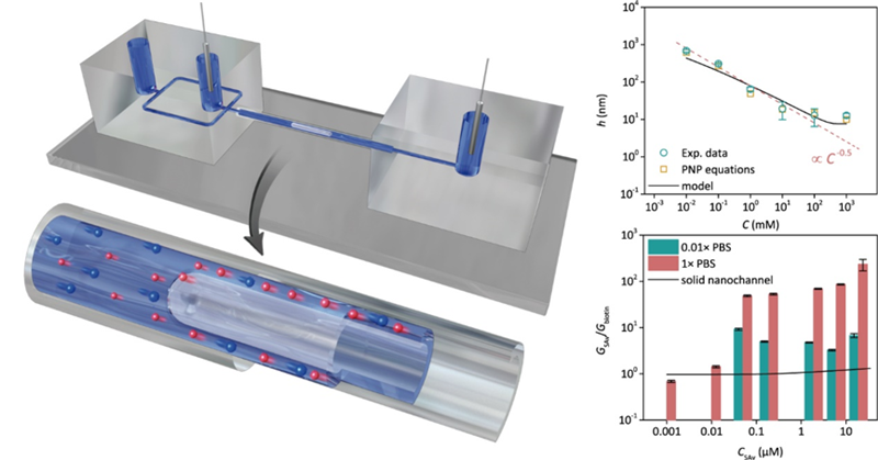 纳米通道是进行纳米尺度中物质传输和能量转换等方面研究的重要平台,而界面属性和尺寸是决定了纳米通道属性和研究对象的两个关键物理参数。该研究利用微气泡在圆柱形玻璃毛细管中形成的液体薄膜作为纳米通道,不仅极大地降低了纳米通道的制作技术成本,同时也构建了固-液-气三相界面的新型纳米通道。该研究发现液体薄膜的厚度与溶液中的离子浓度,pH以及固体界面的浸润性均有关系,并通过测量阻抗等方法研究出液膜厚度在10~1000nm之间变化的规律。