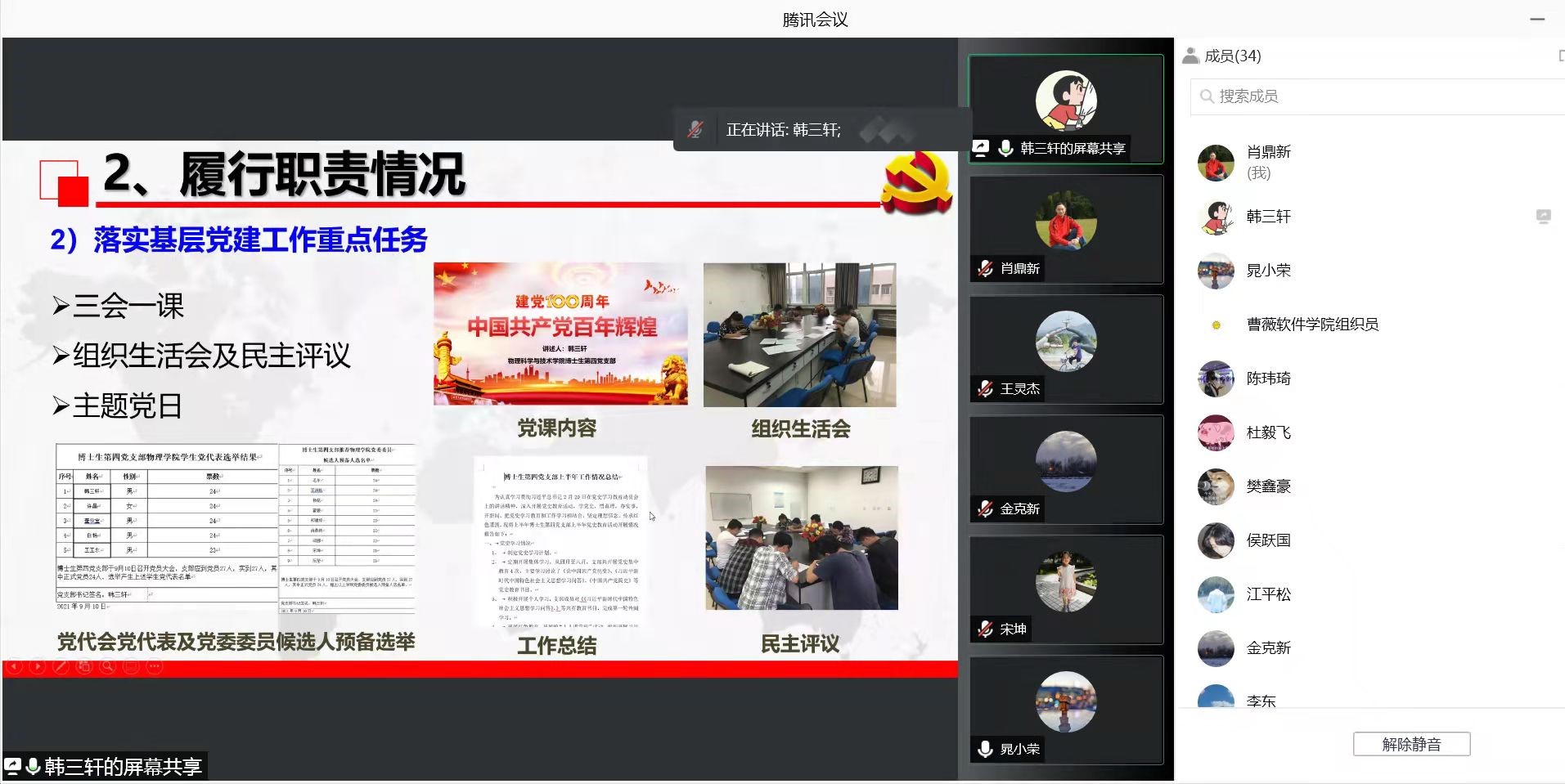 党委召开了2021年党支部书记抓党建述职评议考核大会。评议考核组由学院党委委员、教师代表、学生代表组成,会议还特别邀请了化学与化工学院党委副书记姚冬冬和数学与统计学院党委副书记张莹参会指导。会议由学院党委书记晁小荣主持,物理学院所有师生党支部书记参加会议。