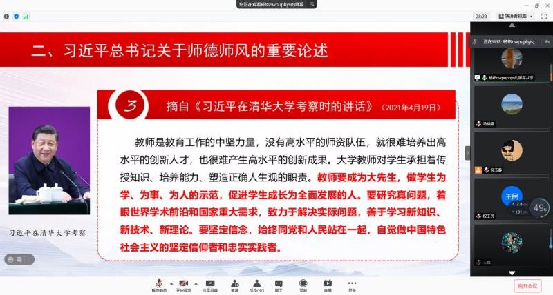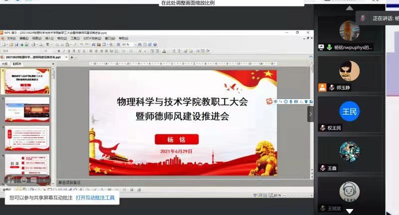 为贯彻落实《教育部关于在教育系统开展师德专题教育的通知》、《剧情 开展师德专题教育实施方案》等,进一步加强物理学院教职工师德师风建设,营造良好师德师风氛围,提升教师队伍整体素质。6月29日晚上,物理学院召开全体教职工大会暨师德师风建设推进会。学院全体教职工90余人参加会议,会议采用线上会议的方式召开,由学院党委书记杨铭主持。