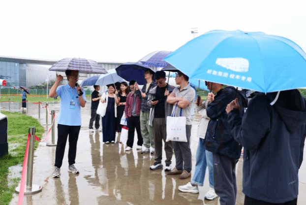 在长安校区军工素质教育实践中心(飞机展示区),校友们冒雨参观航空航天装备展示。雨点浇不灭热情,大家纷纷用手机记录,聆听讲解员讲述装备背后西工大人的贡献,不时发出赞叹。