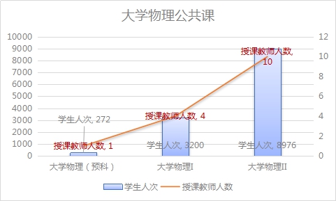 共计开课29门,其中包含全校公共课程:大学物理(预科),共计1班,2门次;授课教师1人,2人次;涉及学生68人,共计参与网络授课学生272人次。大学物理I,共计5个班,10门次;授课教师4人,10人次,涉及学生800人,共计参与网络授课学生3200人次。大学物理II,共计14个班,28门次;授课教师10人,28人次;涉及学生2244人,共计参与网络授课学生8976人次。大学物理公共课程共计20个班,涉及学生3112人,8976人次,授课教师15人。专业课程9门,9个班,16门次;3个专业,涉及学生486人,859人次,授课教师8人,16人次。