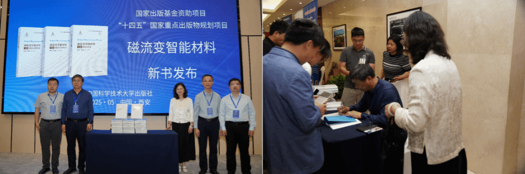 报告中段,张劲军教授、龚兴龙教授、中国科学技术大学邓华夏教授、中国科学技术大学王宇副教授、中国科学技术大学出版社副社长李芳宇共同主持国家出版基金资助项目、“十四五”国家重点出版物规划项目《磁流变智能材料》新书发布仪式,中国科学技术大学出版社副社长李芳宇发表讲话。全体参会嘉宾在发布会结束后进行了合影留念,并进行《磁流变智能材料》作者签售活动。