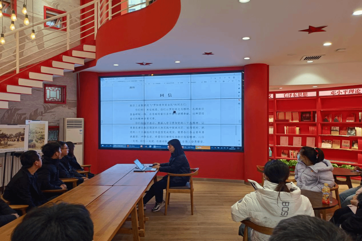 再次学习习近平总书记给中国航空工业集团沈飞“罗阳青年突击队”队员们的回信。毛珊老师介绍到,罗阳同志爱党爱国、热爱航空,为航空工业的发展鞠躬尽瘁,直至奋斗到生命的最后一刻。启示我们当代大学生争做有理想、敢担当、能吃苦、肯奋斗的新时代青年,为祖国的航空事业发展、中华民族的伟大复兴事业添砖加瓦。