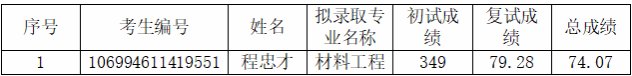 考生朱定强,考生编号106994611212756,主动自愿放弃剧情 材料工程的拟录取资格,经学院研究生招生工作小组审核通过,现根据成绩依次候补录名单公示如下: