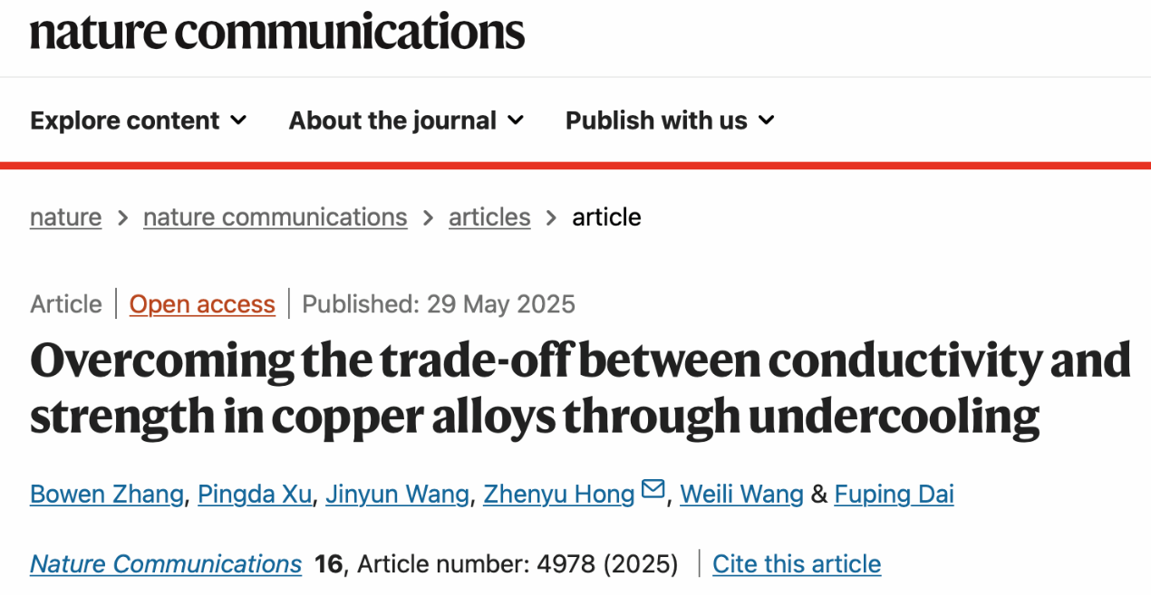 洪振宇教授课题组利用无容器处理技术在铜合金组织与性能调控领域取得重要研究进展。研究发现,铍铜合金熔体在深过冷凝固过程中可产生球形富铍团簇组织,该组织能大幅度提升合金的综合性能。相关研究成果以“Overcoming the trade-off between conductivity and strength in copper alloys through undercooling”为题发表于国际高水平期刊《Nature Communications》,并被编辑遴选为特色文章(Featured articles)。