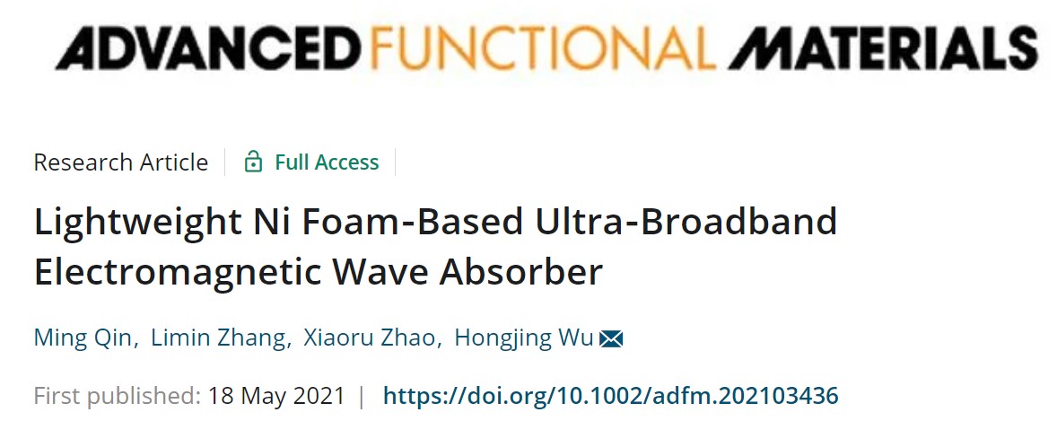 青年教师吴宏景副教授在电磁波吸收领域取得重要进展。该研究将泡沫镍基材料应用于吸波领域,首次获得了轻质、高效的金属基吸波材料。研究成果以“Lightweight Ni foam-based ultra-broadband electromagnetic wave absorber”为题,在国际知名期刊《Advanced Functional Materials》上发表。论文第一作者为该院博士研究生秦明,通讯作者为吴宏景副教授。论文网址://doi.org/10.1002/adfm.202103436。