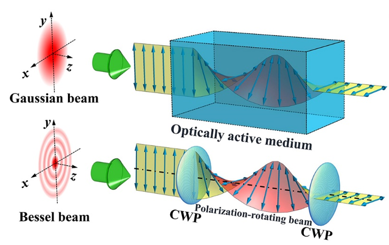 光场调控是物理学领域一个历久弥新的课题。一方面,对光场强度、相位、偏振和时域等的调控产生了一系列新颖特性的光场和物理效应。另一方面,新型光场丰富的自由度为调控光与物质的相互作用提供了更大的便利。两方面研究极大地促进了激光技术及应用的发展。在新型光场传输调控方面,赵建林教授、刘圣副教授团队与南京大学陆延青课题组、南开大学陈志刚课题组合作。通过设计的一种具有锥波相位的几何相位元件,首次实现了贝塞尔光束在自由空间中的旋光效应。该旋光现象与传统磁致旋光现象有许多类似之处,如线性旋转、圆双折射、旋光色散、非互易性等。基于这种旋光效应的非互易性,可以实现方向相关的偏振旋转器或光隔离器。这种新型的无衍射光束为空间结构光场的研究打开了一扇大门,并为各波段的无介质旋光效应带来新的可能性。刘圣副教授为论文第一作者和通信作者,赵建林教授和南开大学陈志刚教授为共同通信作者。