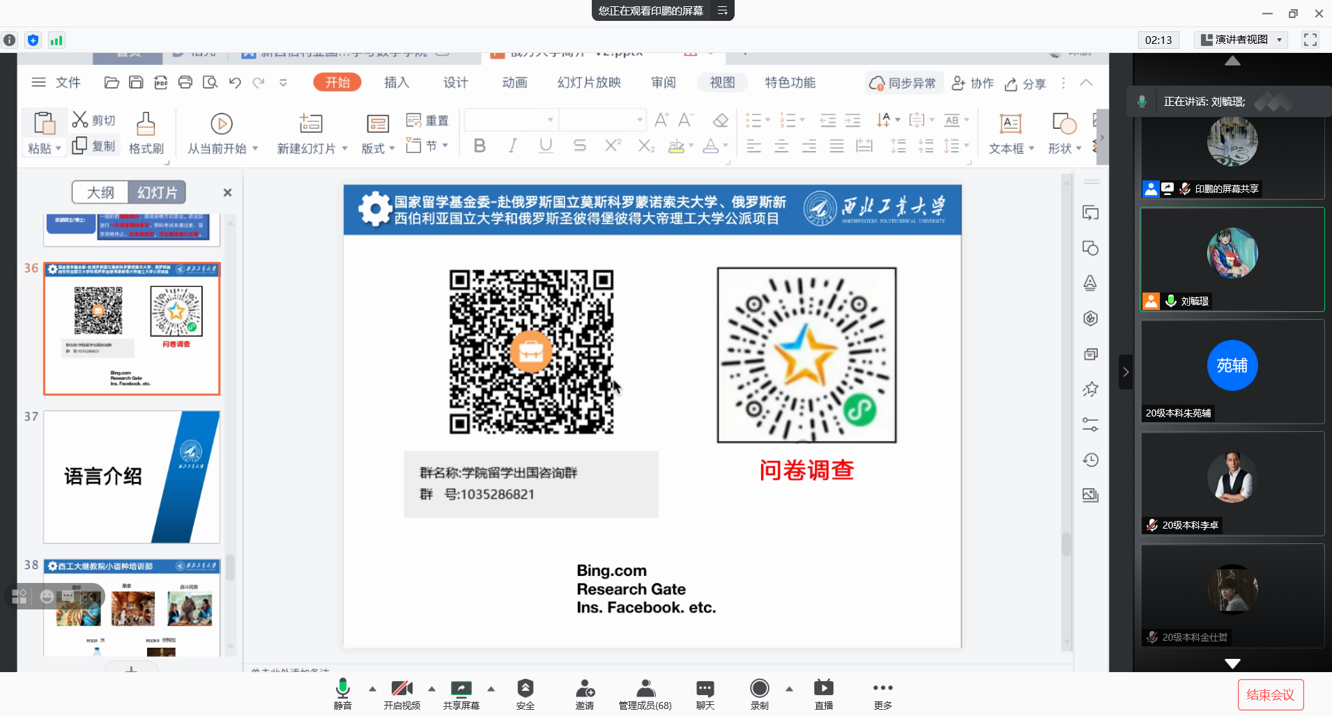 本次宣讲会在第一批宣讲会的基础上,重点向同学们介绍了俄罗斯国立大学、新西伯利亚国立大学和圣彼得堡彼得大帝理工大学国家公派项目。会上就有关学校优势学科及导师信息向同学们做以推广,同时,重点突出了俄方3所高校著名国内外校友,希望能够让同学们意识到留俄的优势及意义。会议后期,老师就俄语学习及留俄经验与同学们分享,希望同学们能够尽早开始俄语学习之路,为申请该项目作出准备。
